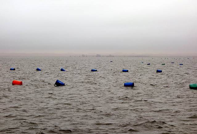 游艇继续往远海进发。远处出现一排浮伐,这是养殖生蚝的基地。因为大西洋本格拉寒流带来的丰富营养,使鲸湾附近的海域海产丰富,也使渔业成为纳米比亚第三大支柱产业。