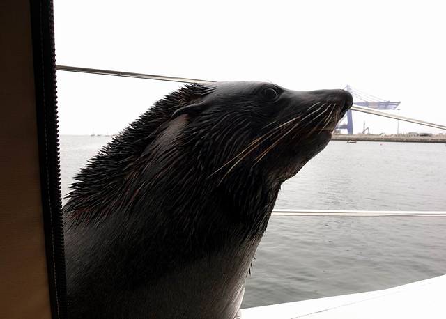 游艇靠岸,上面还有一位不请自来的客人——一只肥硕的海狮。因为海豚游是这里的常规项目,所以海狮们都知道上船就有早饭吃,而且是每只海狮都有自己固定的游艇。
