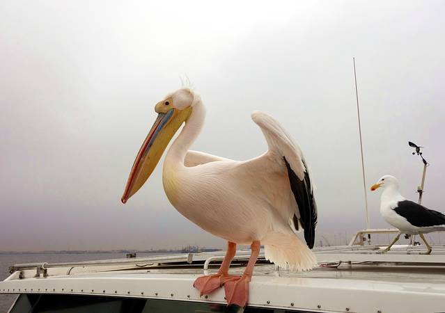 游艇上 站着一只鹈鹕和一只海鸥。这绝对不是某个人摆在这里收钱拍照的那种。这是野生鹈鹕不请自来。