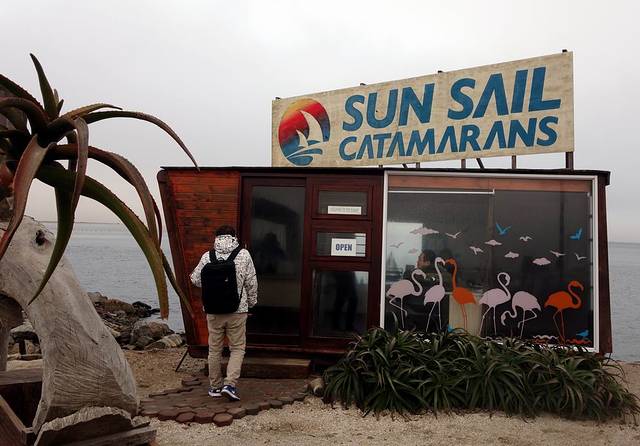 在火烈鸟别墅精品酒店吃过早餐,我们驱车前往鲸湾的游艇码头,参加——“海豚游”。图为海豚游的售票处。