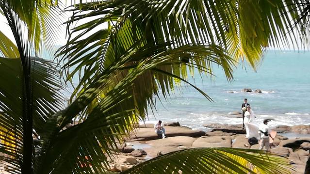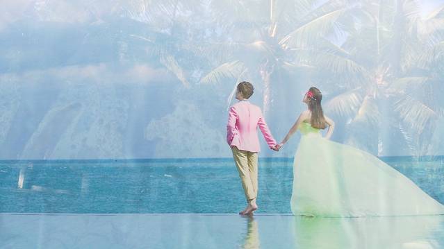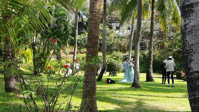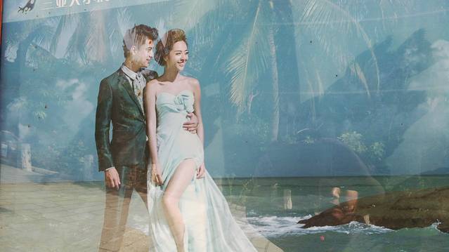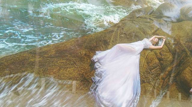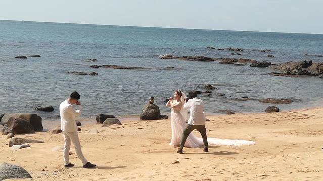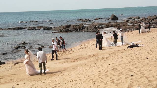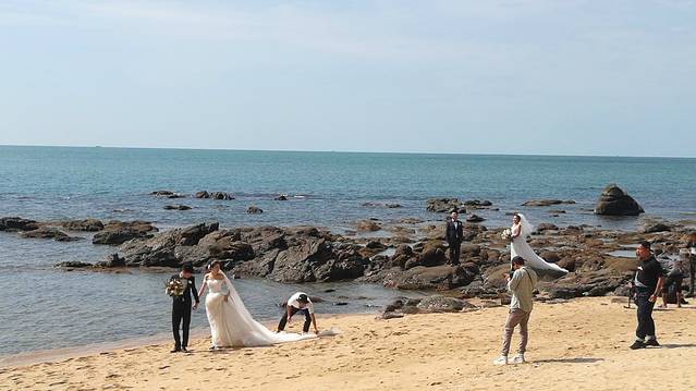 三亚南山大小洞天独特的景观,迷人的风光,吸引了众多即将步入婚姻的情侣。每天到景区拍婚纱照的新人,据说都不止200对。这就使得大小洞天成为了海南最大的婚纱摄影基地。需要说明的是,做为局外人,我不能近距离地拍摄别人的婚纱照片,所以无法在此展示新人们美丽的婚纱照,近影照只能借助于景区展示的图片了,抱歉。