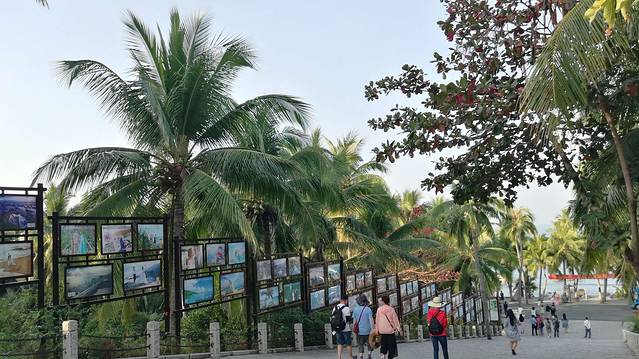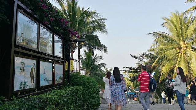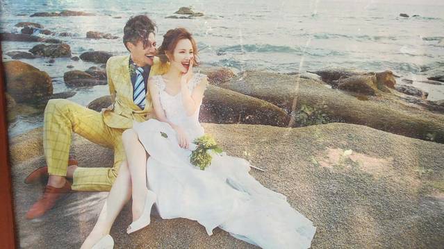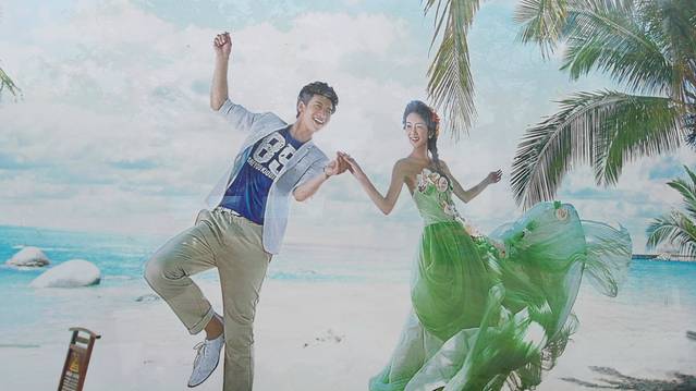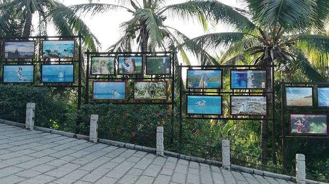 1、 进入景区,走到斜坡处,左手边长长的橱窗里全都是帅男靓女们甜蜜浪漫的婚纱照片,让路过的少男少女们心驰神往,也让已经在围城中的过男过女们恨不当初。