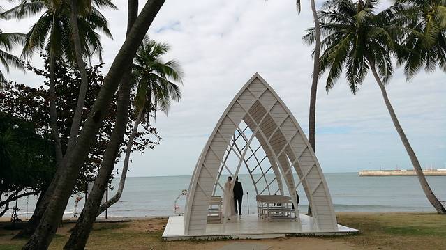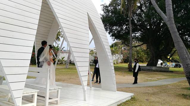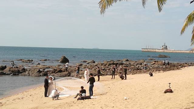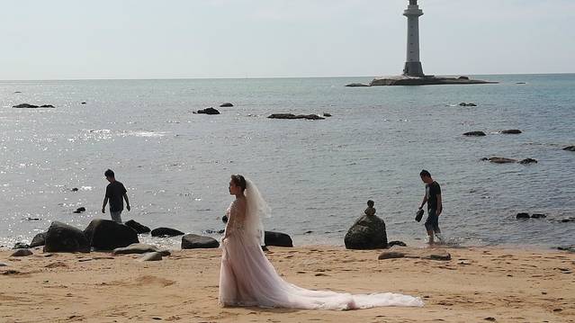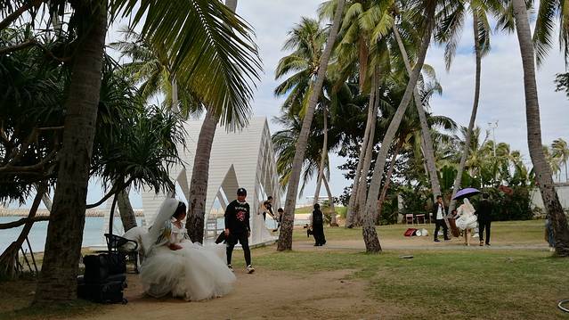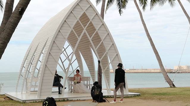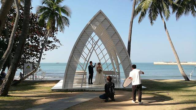 2、 下到坡底,右手边50米的海边,就是一处婚纱拍摄场地。白色的船帆式的殿堂,正是新人们并肩望海,互诉衷肠的好地方。景区安排有专人按提前预约的顺序,排队来取景拍摄。