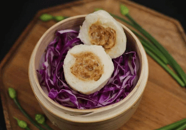 最后将鱼泥与肉馅用巧手融合。看起来简单,做起来难,刚柔并济的力道,让鱼泥完全包裹住鲜肉而不破,兼以5秒1个的速度,若非长年累月的练习,着实难以做到。