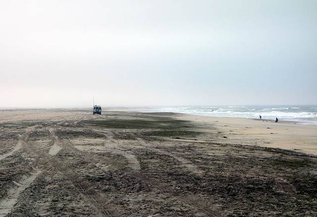 这里好像是一个旅游景点,沙滩上有人乘吉普车冲沙。