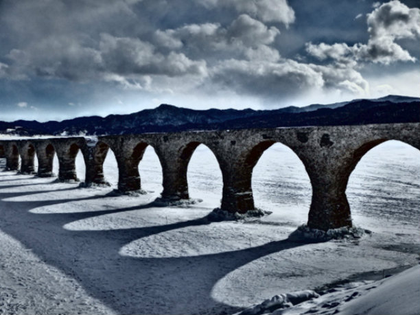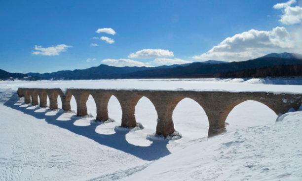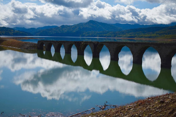 首先为您介绍的是,北海道的糠平湖幻之桥。这里本来是支撑着日本产业急速发展时代的铁道桥,随着时代的进步而完成了它的使命,这条线也就消失了,只剩下了现在的这座桥梁。