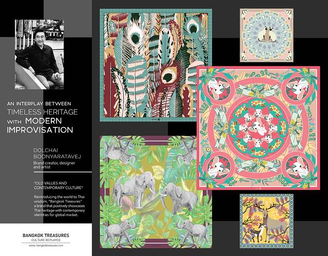 曼谷泰丝设计师品牌—Bangkok Treasures, 品牌创始人Dolchai Boonyaratavej,既是设计师也是艺术家。他看到了泰丝的价值,并想把泰丝传承和发扬光大,于是创立了这个品牌,率先把传统泰丝和色丁相结合,这样制成的丝巾相比传统泰丝来说在光泽度、垂坠感和手感方面都要更出色。