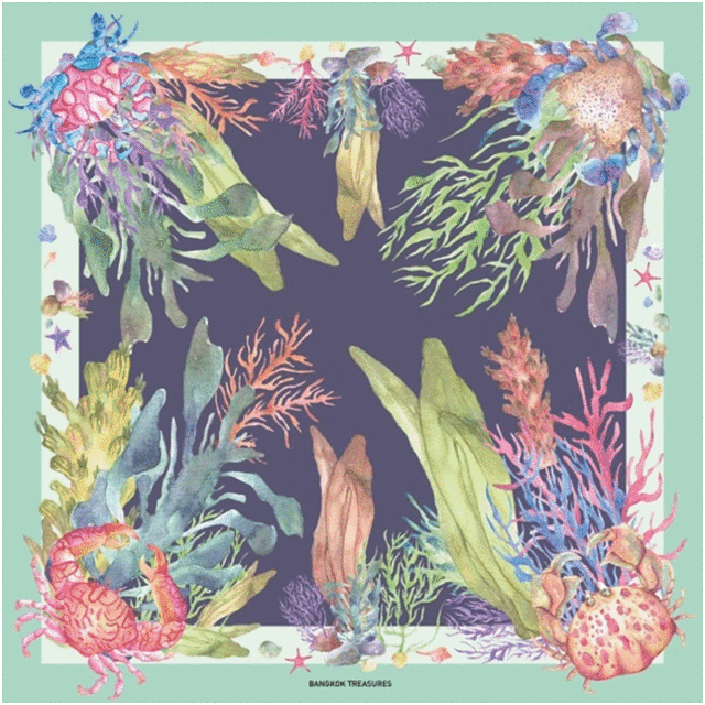 这个设计就让我看到了设计师的诚意,他把自己对泰国珍宝的理解融合在丝巾的图案上,选取最宝贵的大海意象,加上了泰国人一向喜爱的柔美色调,最后给我们呈现出这个可爱的设计图。