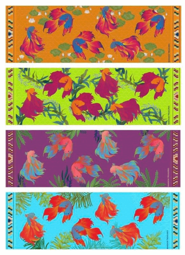 下面这块丝巾图案上面的鱼,叫暹罗斗鱼。既然是暹罗,那大家肯定都知道这是只属于泰国的斗鱼。和所有的斗鱼一样,它们成双成对出现,然后勇敢地决斗。泰国人认为暹罗斗鱼是勇敢的化身,设计师把它运用到这里,让它成为了曼谷宝珍的一部分。希望每一个喜欢它的人都能因此得到满满的勇气,也能够把这一份勇气带回家。