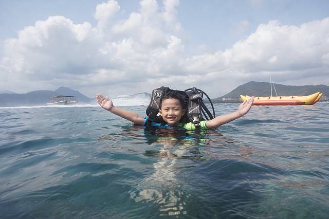 这里的潜水小朋友只要1.2米以上就可以玩,晒一下我们同行的小帅哥,6岁半的小六一,勇敢的潜水👍🏻