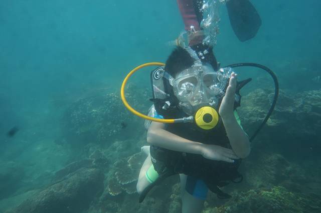 一日游的项目包含了深潜,加井岛的深潜只有四五米的深度,适合初学者~深潜的体验感跟浮潜差不多,水底的珊瑚和礁石会更美一些~
