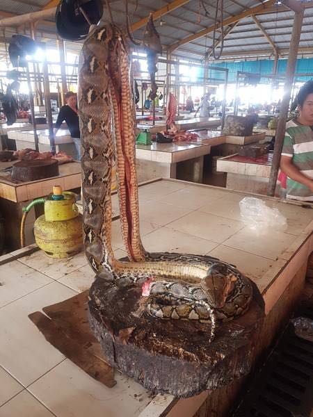 托莫洪(Tomohon)传统市场,也被称作“恐怖市场”。距离市区大约1个小时车程,在这里你可以看到被截掉翅膀的蝙蝠、被拔掉毛抛开肚皮的小狗。在摊位前驻足,摊主会拎起血淋林的野猪头笑着和你打招呼。