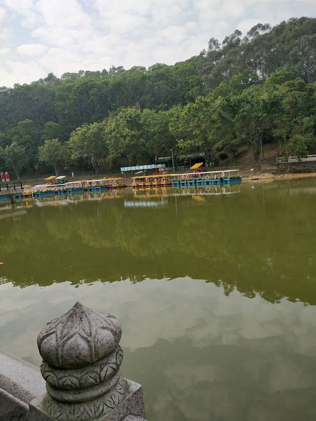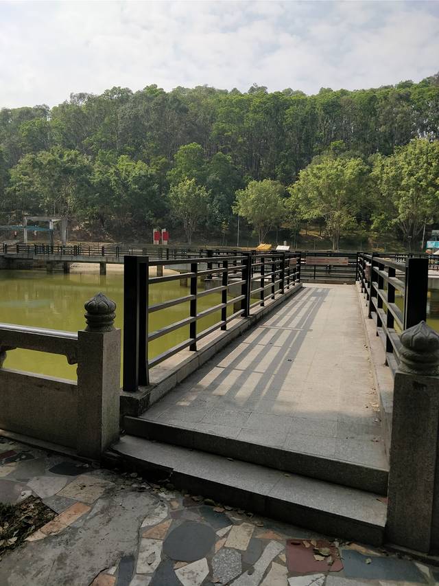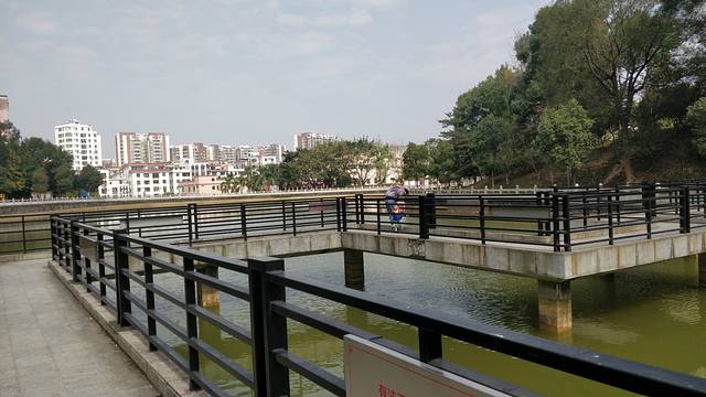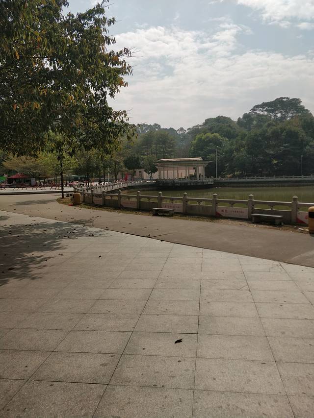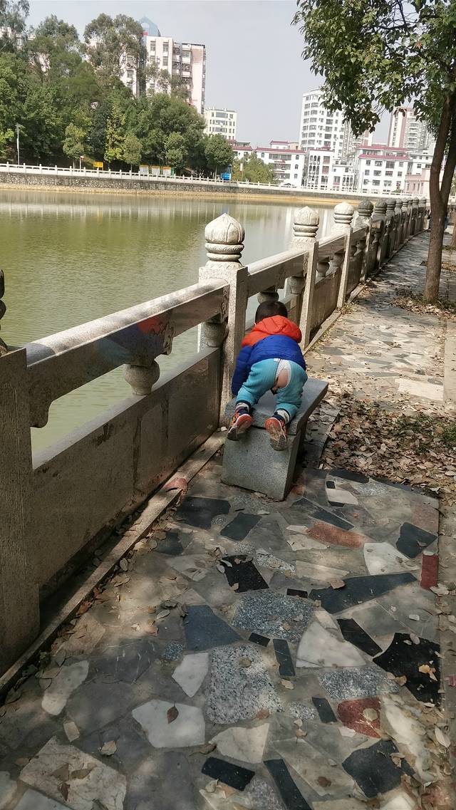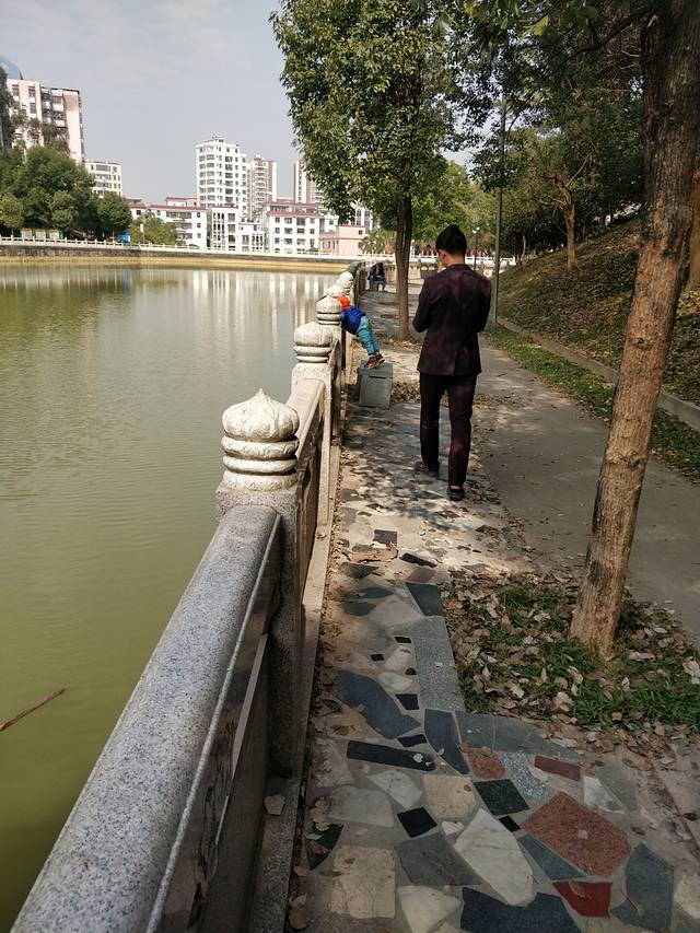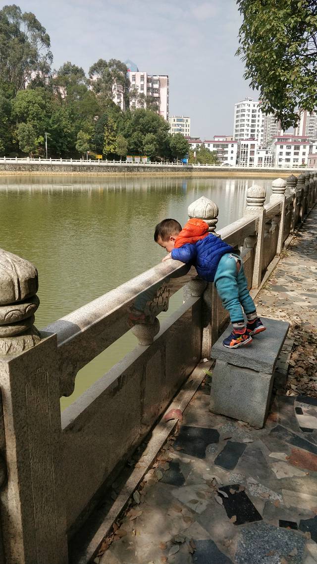 2019年1月27日,在围村烧鹅大排档吃过午饭,开车来到崖山公园。儿子对于湖情有独钟,一下车就直奔小湖去。小家伙喥着脚跟看湖里的金鱼游来游去的。如果喜欢划船,湖里还有船,也就三四十元一艘。还有走廊穿过湖中央,在上面散步很逸意。