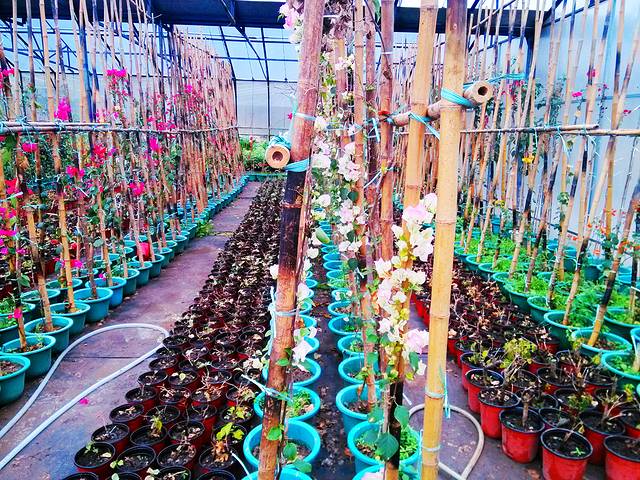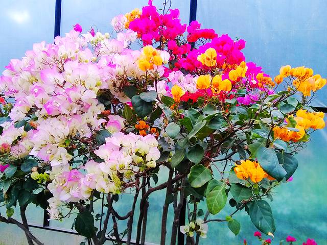 万石植物园早已名声在外,平时就不缺乏游人,更何况逢年过节。过年要的就是那份人气,在这里人多点就多点吧,就算增加点多年的气氛。要说避开人流还是有诀窍的,游客往往集中在热带雨林区、沙生多肉植物区和百花厅几个地方。其他地方还是清净的,譬如花木培育大棚,这里的市花三角梅被嫁接成或清新雅致、或色彩斑斓,姿态万千,就很少有人打扰。