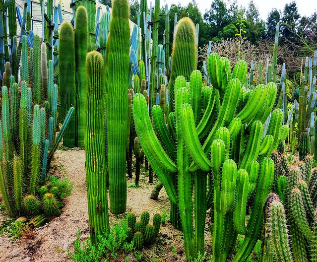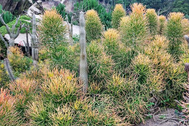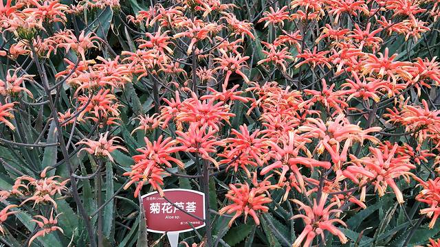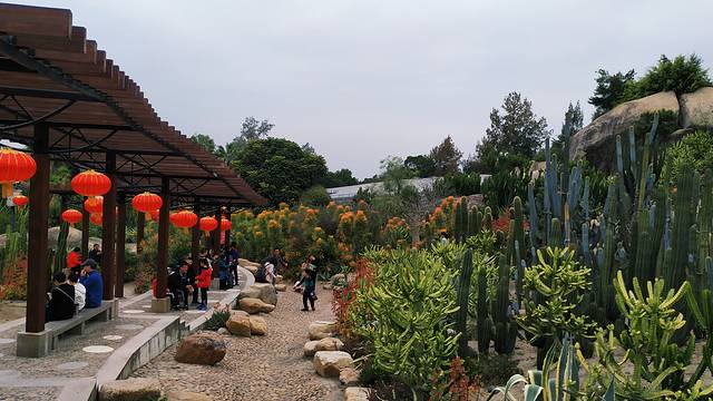 沙生植物区,那些原本生长在气候干燥、风大沙多、日照强烈恶劣环境下的植物,竟能把这温暖湿润的植物园当做沙漠中的绿洲,长得生气勃勃。多肉植物园区扩大了规模,多肉植物都挂上简介标牌,大红灯笼渲染出过年喜庆的气氛。