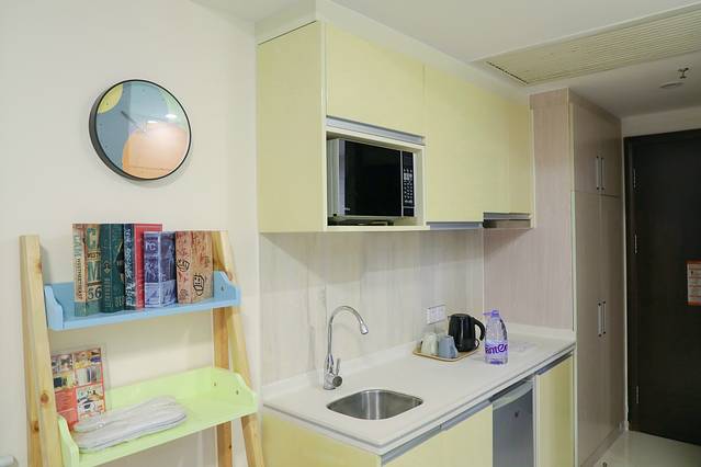 整个房间虽说不是很大,但丰富的色彩会给旅途温馨的感觉,一个人旅行最怕的就是冷冰冰又空荡荡的房间,虽说是公寓没有厨具可以理解,微波炉可以满足旅行的日常所需。