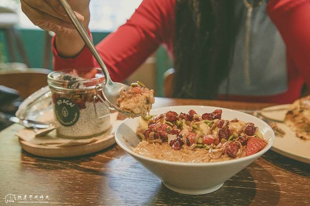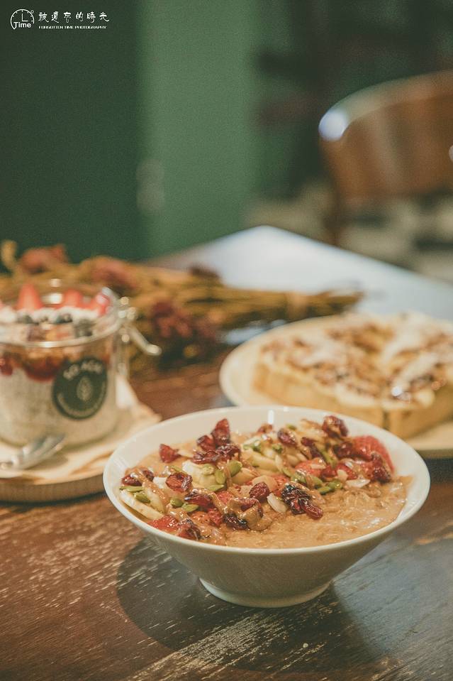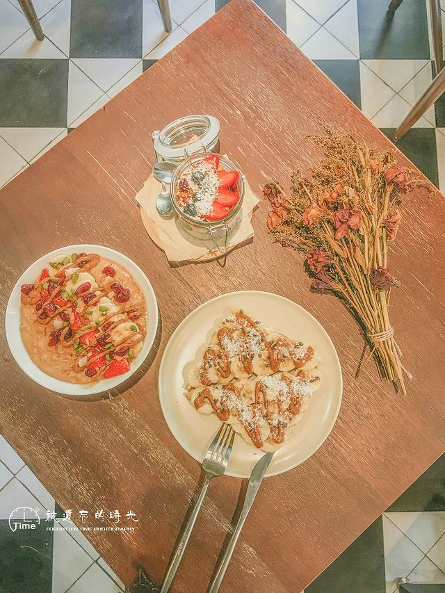 翻了翻菜单,其实可以选择的种类不是非常的多,点了一份店家的套餐,椰香亚奇籽布丁、暖呼呼杏仁奶燕麦碗、香喷喷香蕉杏仁酱吐司。