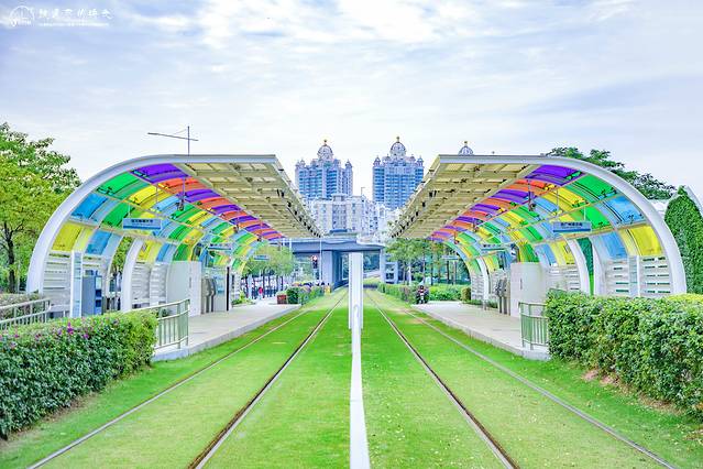一路上的车站五彩斑斓的颜色,绿荫草坪蓝天白云,铁轨旁软软的草坪,低矮的站台和随时都在变化的信号灯,想不到繁华的广州也有童话世界的一面,远处一声温和的鸣笛,从童话世界出发的列车即将进站,带我观赏有轨电车这最美的7公里。