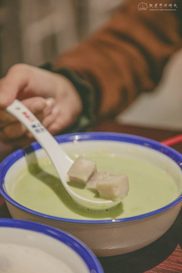 豆浆里可以添加很多种配料,去的比较晚了,芋圆卖光了,只能加了一份芋头,还可以往豆浆里加红豆、鸡蛋等等,一碗原谅色的豆浆叫做泰式红豆豆浆,还以为是泰式冬阴功的味道,结果比较失望,除了一抹绿色和普通豆浆没什么区别。