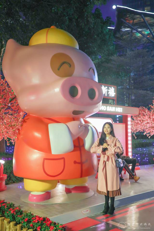 麦兜带你喜迎新春第一站,麦兜萌萌巴士站,高达4米的麦兜雕像,从远处望去就非常引人注目。身穿唐装笑成“蒙猪眼”的麦兜,正双手作揖向大家拜年。