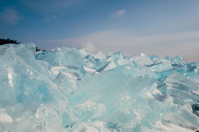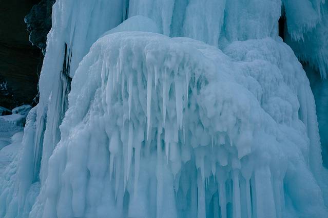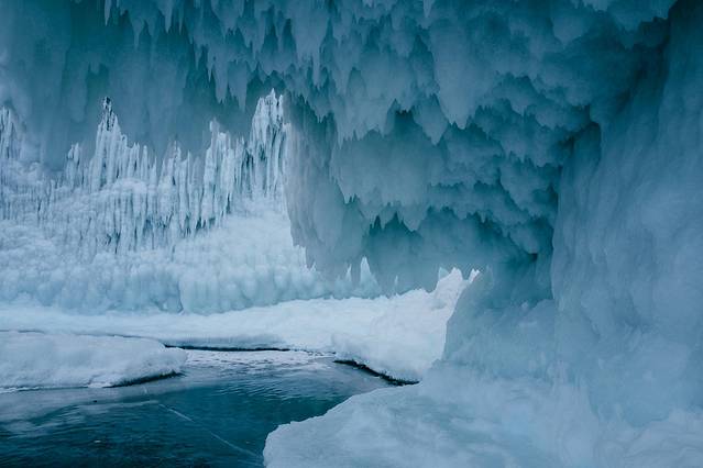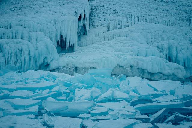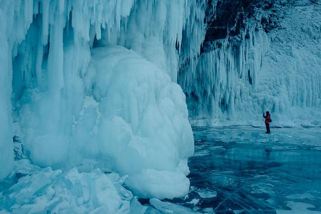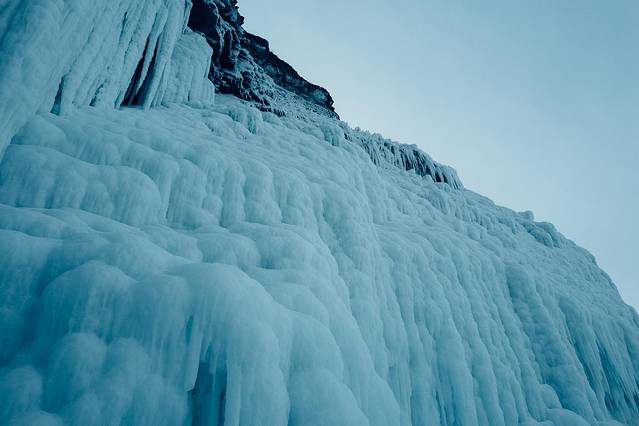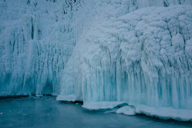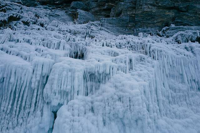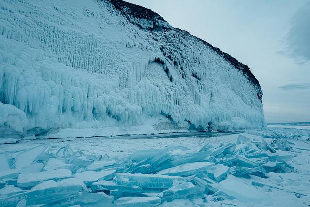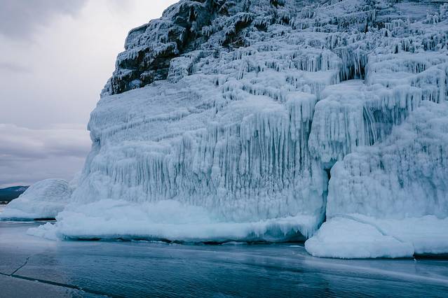 贝加尔湖 是世界上最深的湖泊,地处寒冷的西伯利亚地区。每年冬季,持续且强烈的极寒风暴会向沿岸的山地注入大量雨水,而水汽沿着山崖流下,在零下的温度中立即凝结,同时寒风在湖面上激起巨浪,不断冲刷拍击岸边,从而形成我们眼前的奇妙景象。