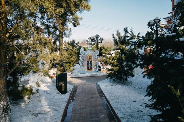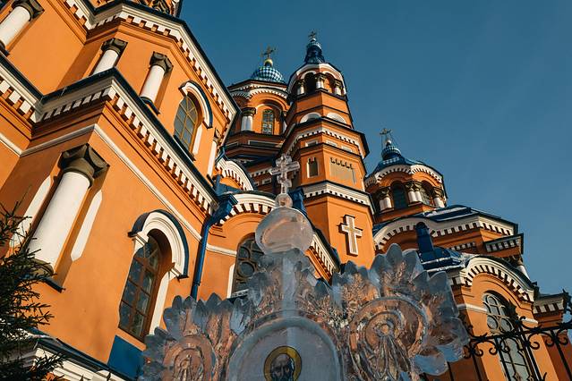 愿望没能实现,但目的地不逊于河景。 喀山 圣母大教堂,伊尔库兹克市区最大的东正教堂,无论是外观还是内在,都只能用无比华丽来形容。她像镶嵌在伊尔库王冠上的瑰宝,召唤着每一位旅人前来仰望。