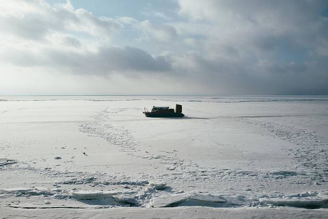 沿途分布着众多船坞码头,渔船、游轮静止于湖面,等到冰雪融化,湖面解封,停靠了一冬的船只便又该忙碌不歇了。风雪渐止,阳光重现。向远方望去,冰面广阔无垠,一望无际。不远处,一艘气垫船飞驰着赶上我们,并转而超越。在这座白色的世界里,冰上的船比陆上的车来的更为狂放自由。