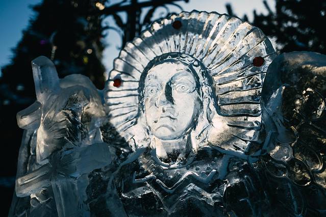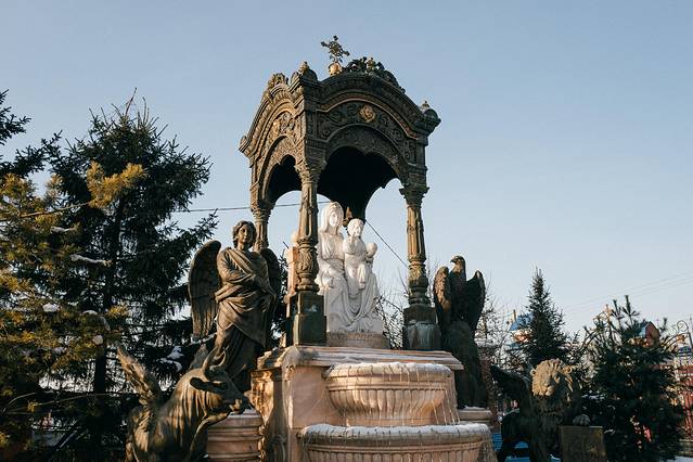 此时教堂的院落内鲜有游人。院落一角的鸽笼中,不时有白鸽跃出,展翅飞向无云的蓝色苍穹。小径两边分布着众多宗教主题的冰雕,雕工精美,在阳光下晶莹剔透。洁白的圣母像端坐在院落中央。