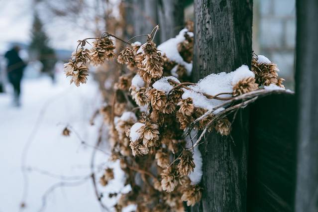 木篱笆隔出了一处处小小的院落,雪面没有走动的痕迹,纯净至极。向远处看,这一带的风景充满了 平和 与静谧,冬雪点缀着世间万物。除去我们踏雪的脚步声,四下一片岑寂,连光秃的树枝都静止不动。