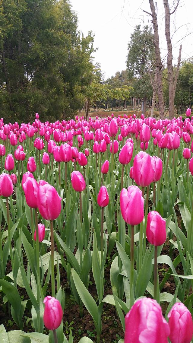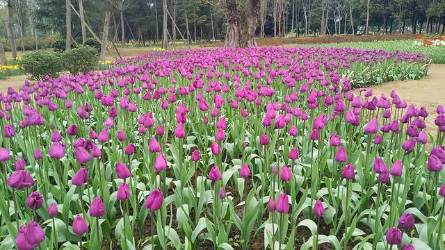 一踏入景区,春的气息扑面而来,绚丽多彩的郁金香花海,如织锦般铺垫在林间、草地上、路基旁,纯美的让人目不暇接。朵朵如酒杯状的郁金香花朵,又大又艳、红的、黄的、粉的、白的……几乎要穷尽人间所有颜色。