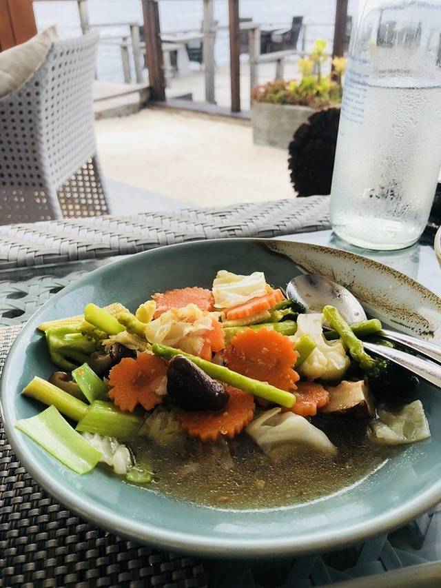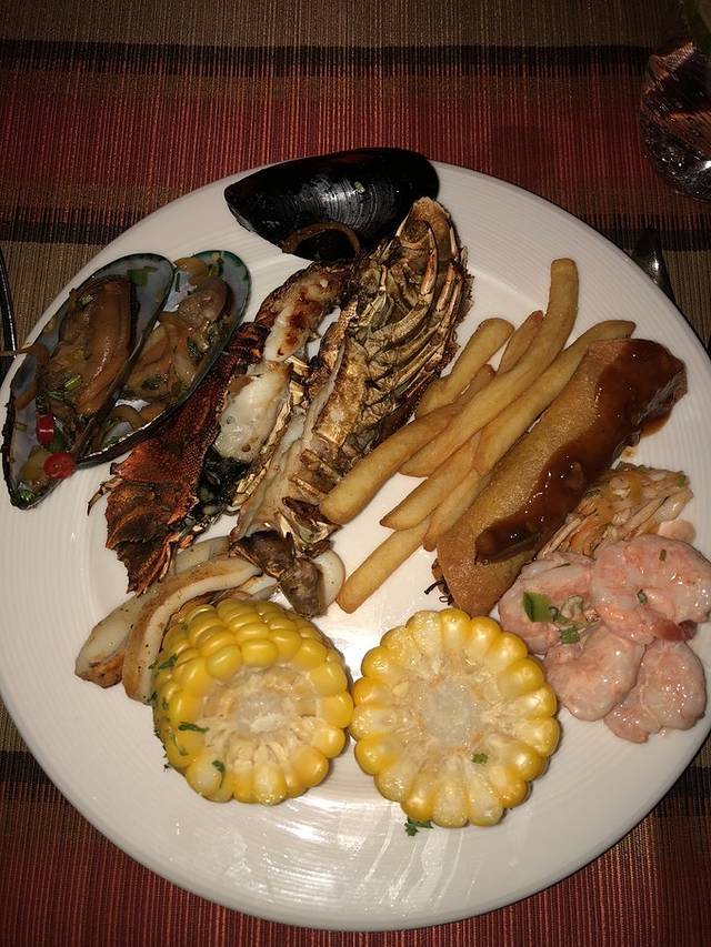 美食。因为买了Pure Included套餐,所有岛上餐厅酒吧的用餐及饮料都是免费的,但个别品项是收费的,点单时需要注意。餐厅里也都有中文菜单,不需要担心。三间餐厅分别是The Market(综合自助),Benjarong(泰餐)和SeaGrill(烧烤西餐等)。我们利用最多也最喜欢的是Seagrill,那间餐厅的调酒是最好喝的,服务生也最nice,会给你试不同的酒。另外,这间餐厅旁边就是公共泳池和Sand Bar(有DJ的酒吧)。并且礼拜四和礼拜六还有龙虾对折活动,60刀一公斤的龙虾足足把我们撑得饱饱的(龙虾是需要另外付费的)。Benjarong是地道的泰餐,第一天下午1点上岛后,我们先去了这里吃午饭,2点前都可以点单。晚餐的菜单会比午餐丰富一些,而且这家餐厅的菜量偏多。如果吃的不多,建议可以少点一些。The Market只提供早餐和晚餐,礼拜三晚上是BBQ(有龙虾烧烤),礼拜六晚上是fisherman(也是海鲜烧烤)。Market每天都有不同的菜肴风格,只有这间餐厅有中式菜。除了Market,在其他两间餐厅用晚餐,都需要请管家提前预定。个人感觉如果吃的不多,HB或者AI 就够了,吃太多也会导致肠胃不适。