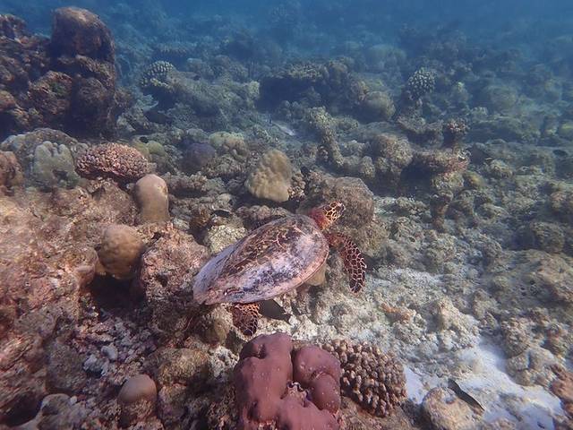 说到浮潜,岛上的海洋活动中心可以免费提供一切装备,自己大可不必背着装备去马代了。所有的装备除了救生衣要每天借出跟归还外,其他都可以在离岛前归还。非常的方便!而且这里可以借脚蹼,一定要借脚蹼。安全的浮潜是在房礁和深海交界处,太浅的水域容易被珊瑚礁划伤,太深的地方水性不好也有危险。沿着岛上洋流地图的方向游,最省力也最容易看到稀有的海洋生物。刚开始先生先去探路,游到深水区时,水温骤降感觉还是蛮吓人的,但后来慢慢适应了就不觉得害怕了。个人觉得安全第一,风浪大的时候不要去浮潜,早上10-12点,下午3-5点两个时段最好,不冷不晒,风平浪静。