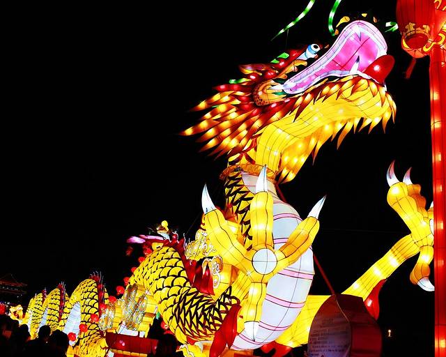 从永宁门地铁口出来,首先映入眼帘的是“狮舞祥瑞”,可爱生动的狮子登高送福,还有许多散落其间的绣球。从南门礼仪广场向永宁门走去,两条百米巨龙盘踞着守护城墙。灯会有5个不同主题的灯区,每一个都别具特色,造型各异的花灯将古城装点得金碧辉煌。