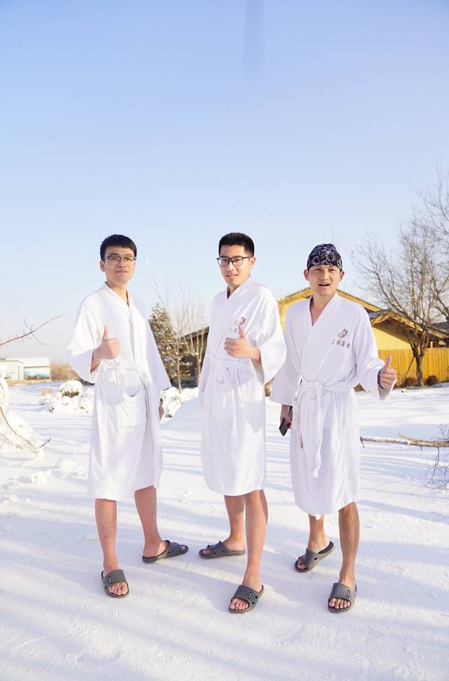 在其中一个小伙伴的提示下,挑战自我,我们穿着浴袍就来到了外边的雪地,于是乎新一轮的拍照模式开启了。