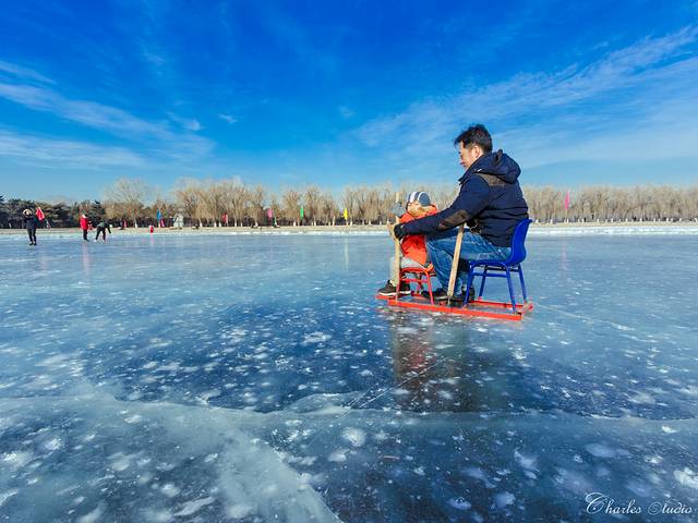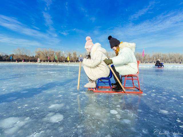 第三个项目就是这个滑冰车,北方朋友称为呲溜滑。拿个小铁凳子,两个用来支撑和掌握方向的小棍子,就这样在冰上耍起来了。这个项目很简单,参与度最高。