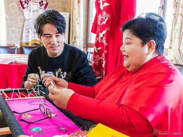 来到这里我们首先体验到的是两项非遗项目盛京满绣和剪纸。两位非遗项目的传承人老师首先为我们讲解了各种的历史和发展沿革,同时亲自示范操作,为我们带来了教学。