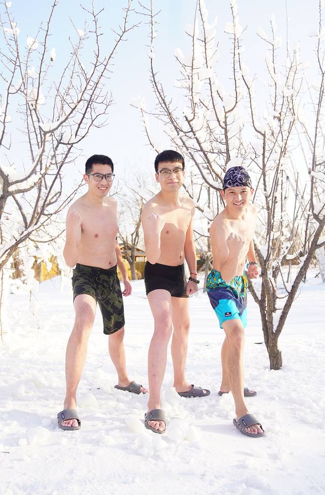 丢掉浴袍,看看我们的三个勇士,一点儿都不冷。