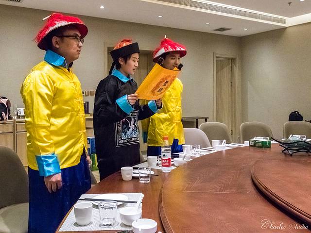 第二个就是这个所谓的接风宴开篇。只见一个身着清廷官袍的大臣带着两名侍卫,拿着圣旨,宣读了圣上的旨意。而大臣一口麻溜的东北话,把我们所有人逗得合不拢嘴,真是非常具有地方民族特色。