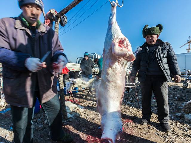 对于肉类品来说,可以看到有一块指定的区域,摊贩们在现场宰杀生猪、牛羊等,一块块新鲜的肉可见于砧板之上。而热气腾腾的麻花也是刚刚出炉,引得路人一阵哄抢,可以看得出这里的市集之热闹。