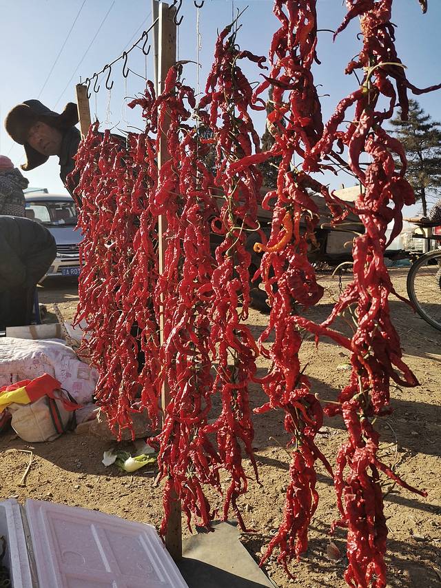 老农摆好了一串串的辣椒,见我在拍照,好奇的探出脑袋看着我。