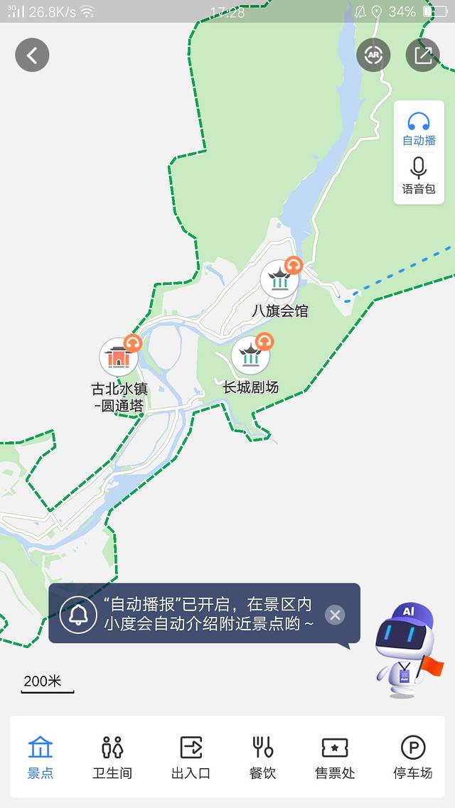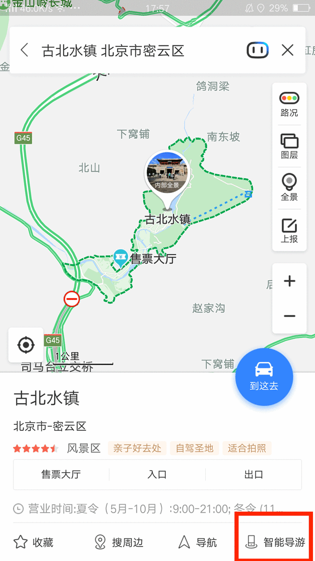 想要了解每个景点,最简单粗暴的方法当然是听讲解~打开百度地图直接定位到古北水镇,点开右下角的【智能导游】功能,就能听地图自动播报关于每个景点的介绍。