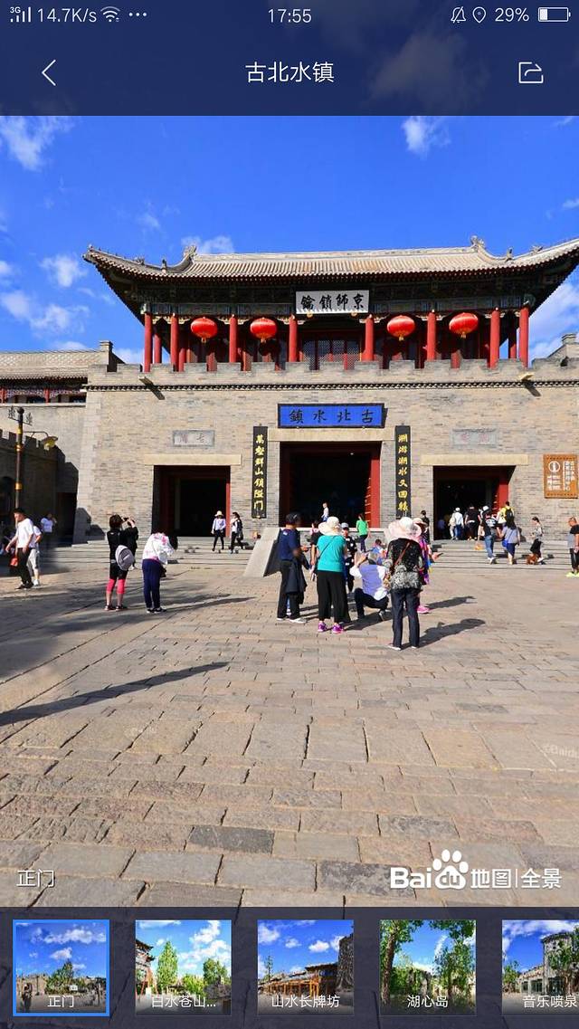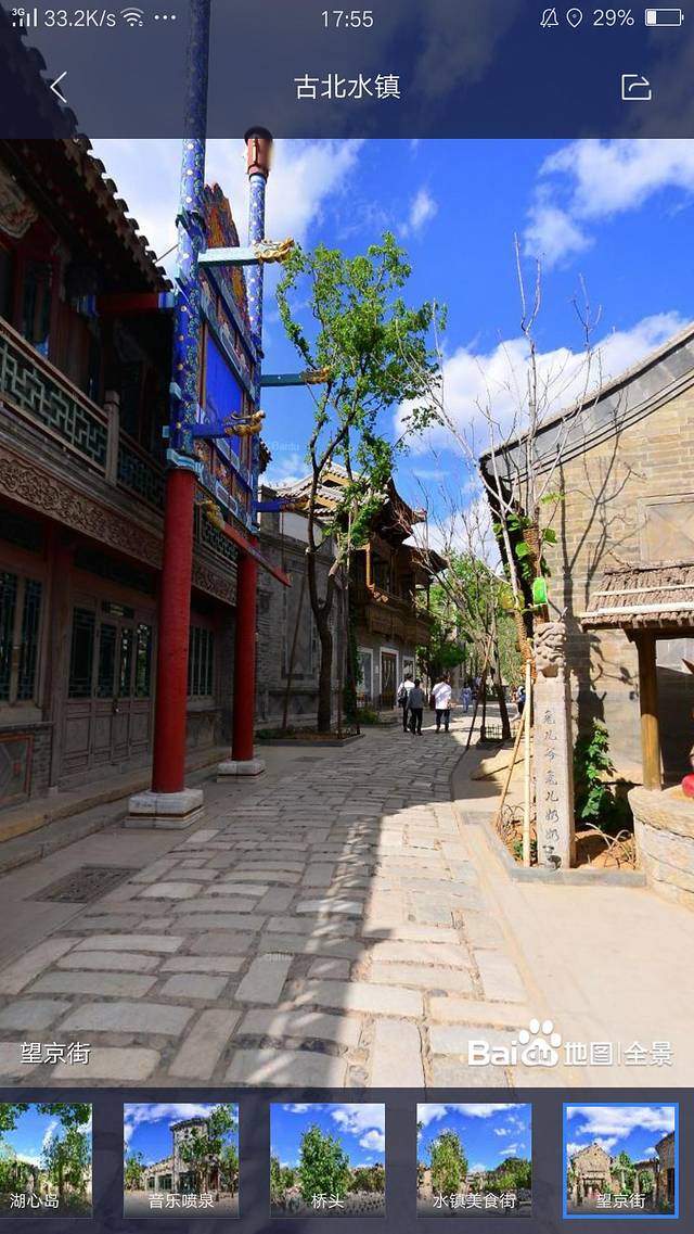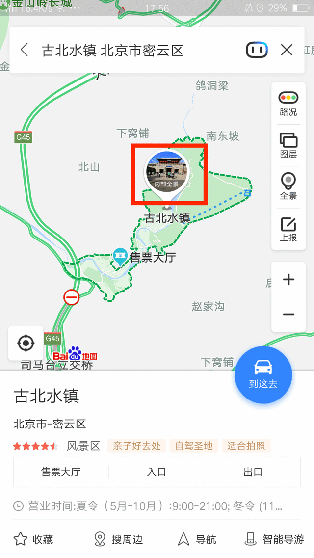 灯光秀虽然好看,但故宫也是人山人海。一想到人挤人就觉得心累,吓得我赶紧找个处于淡季的景点去休闲放松一下。在百度地图上搜索了一下古北水镇,地图的全景功能可以滑动查看景区不同的方位。看了景区内部,觉得风景什么的都还不错,OK就它啦!收拾好东西出发~