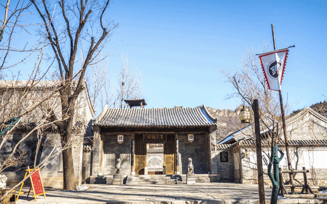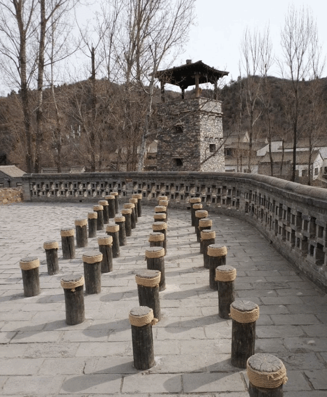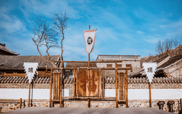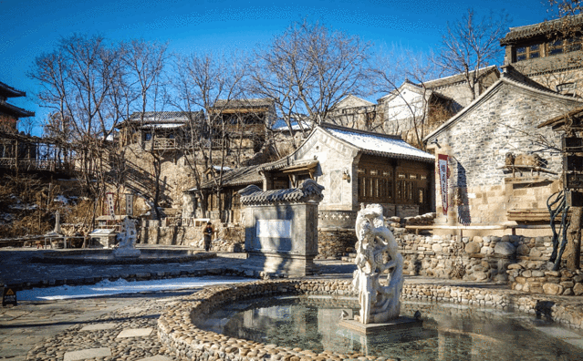 再往东走就是日月岛广场,水镇的大戏台也在这里,经常有各种表演可以观看。最东端是震远镖局,镖局的院落挺深的,建筑结构也很大。门口有一个露天的温泉池,可以坐在这里泡泡脚。院子里面有很多设施用具,像押运的镖车、擂台、梅花桩、账房啥的,可以全面了解古代镖局文化。