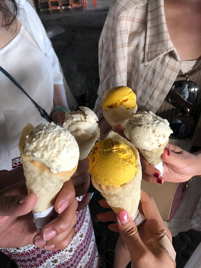 晚餐时间还没有到,餐厅里客朋满座。我们趁着这个空档预定了晚上靠窗位置的餐桌,既然来了肯定要吃一顿再走。我来这里的一个念想是他们这里的冰激凌,很美味也便宜。我们一人一球,有各种口味,真的不错,好吃!