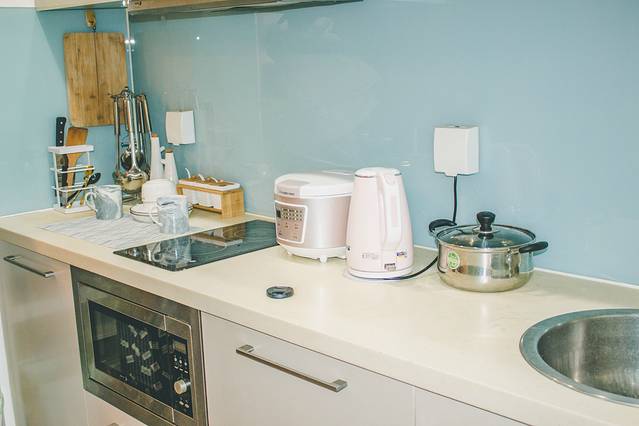 进门玄关处就是厨房,布局就是酒店式公寓的模样,厨房的所有用具餐具一应俱全,只要你有时间烧一顿饭菜也不是不可以的。