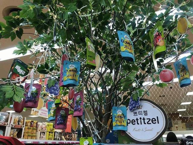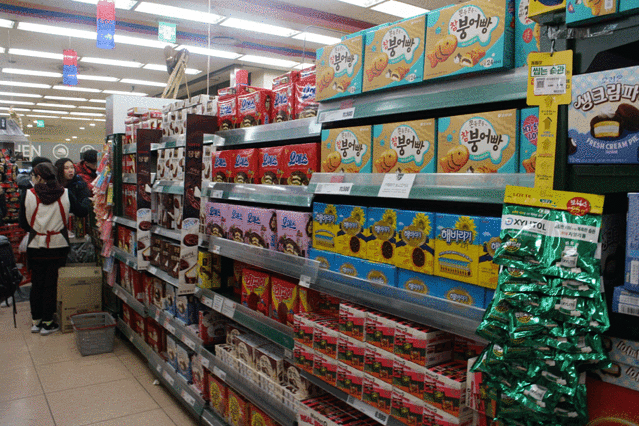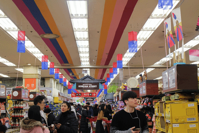 超市现在是浓浓的过年气息啊,到处挂着充满韩式风情的装饰物~外国游客很多嘛,都主要集中在韩国零食区,韩国本地居民也不少~
