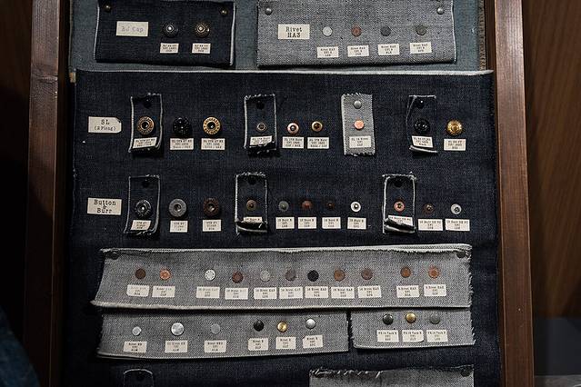 19世纪中期淘金热潮兴起之际,牛仔装作为矿工们的工作服而问世。3层展示的是通常被视为牛仔装的附属品的精细物件,如为提高牛仔装的强度与功能性而发明的铆钉、可承受石磨等强力加工的牛仔装用Y字拉链等。