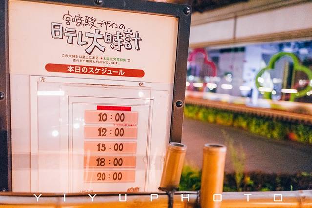 一天有五个时间整点播放,里面的齿轮小人都开始转动,环环相扣,音乐动人,大约是从57分开始,时长四分钟左右。傍晚时分和亮灯的 东京 塔一起,形成一个超现实的景致。