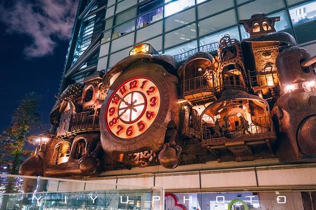 如果你是 宫崎 骏的粉丝,一定要来现代摩登的汐留,出了地铁站在 日本 电视台大楼下就可以看到这座大钟了!它以 宫崎 骏成名漫画哈尔的移动城堡为设计原型修建的,做旧的金属质感复古又魔幻。