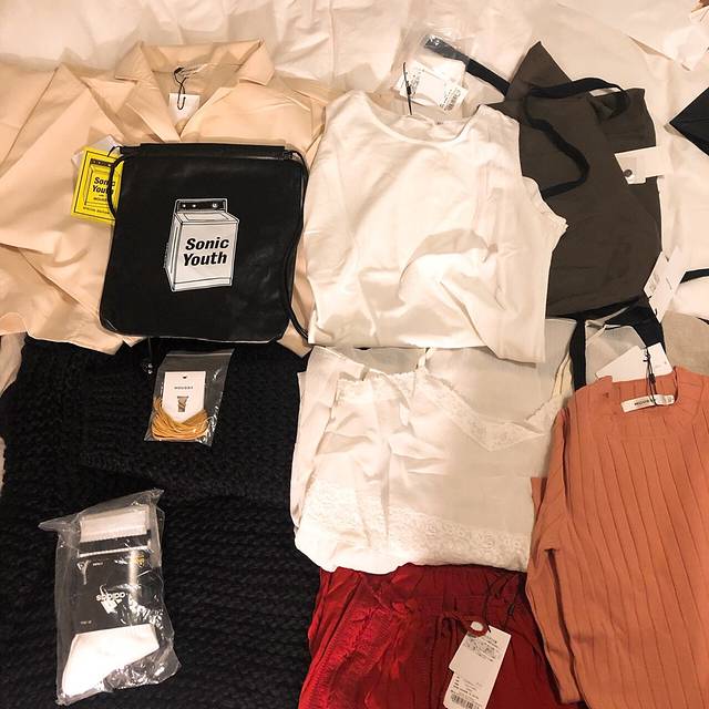 这张是moussy福袋,下午才到以为会抢空,没想到还有很多, 日本 小姐姐们购物都很理智啊,一共十二件,少拍了一条裙子一件衬衣。没有大衣,有的福袋里是有鞋子的,我就使劲摸尽量避免鞋子,很厚重的毛衣top我还以为是件大衣,果然多想了。最上面三件和包包都不大适合我,下面几件实穿性挺好。